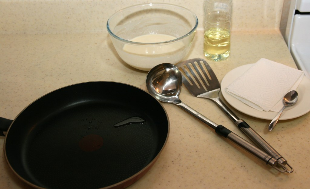 Specific material: a non-stick pan (about 25 cm in diameter), paper towel to remove excess oil from the pan, a ladle to pour the batter into the pan, a spatula to flip the crepes.