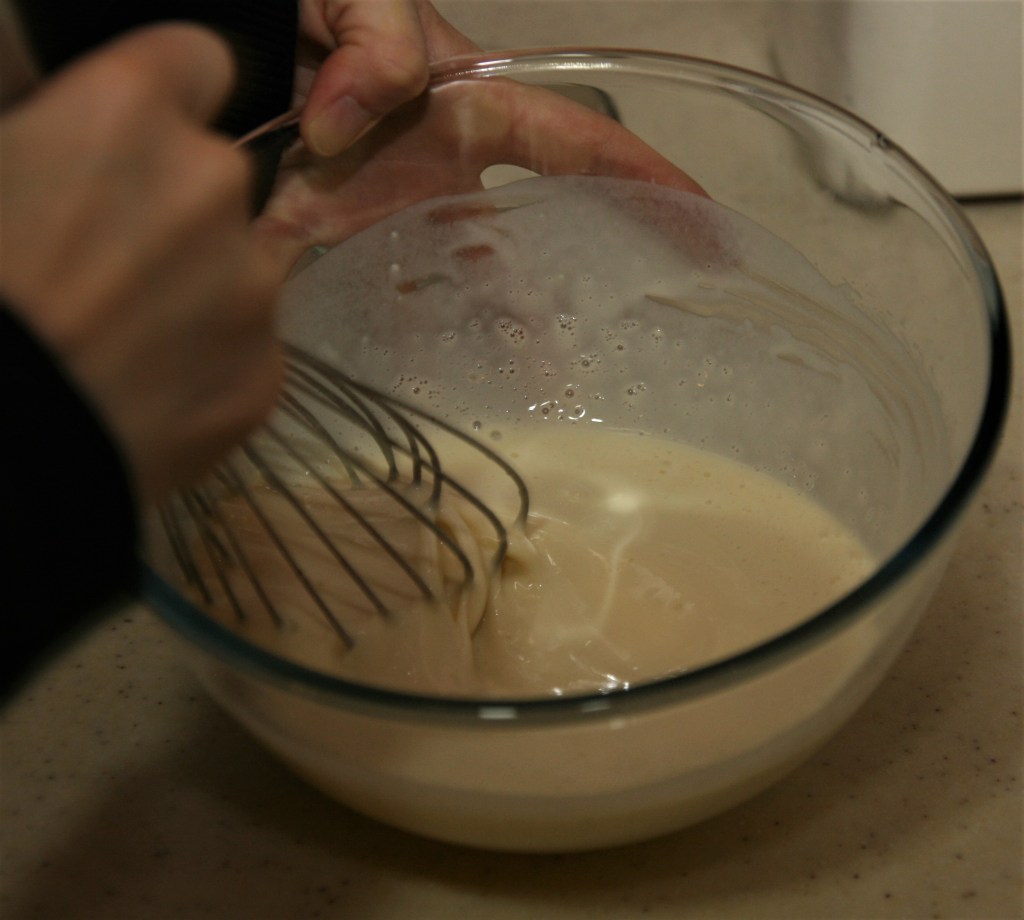 After 30 minutes, remove the batter from the fridge: the batter has a little thickened because the starch swells with water. Whisk the mixture to obtain a homogeneous mixture again. If the batter is too thick, add a little water or milk.