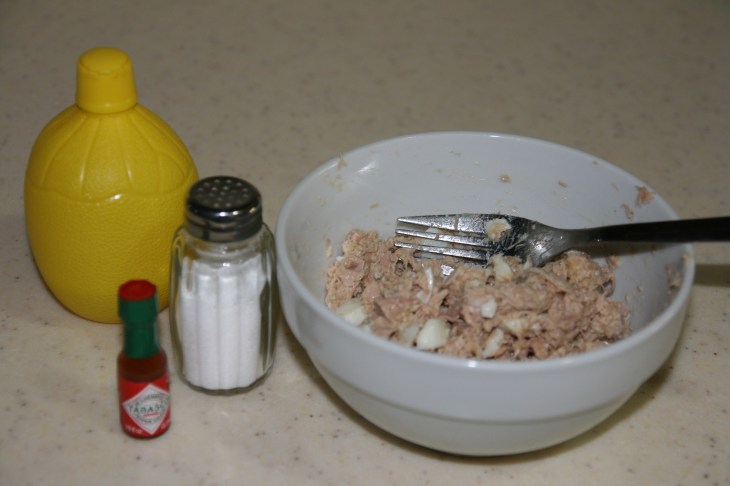 Mettre l’œuf dur sur le thon. Avec une fourchette, écraser l’œuf. Mélanger.
