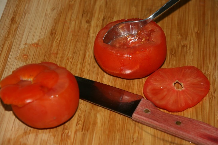 Vider les tomates à l’aide d’une cuillère à café. Conserver dans un bol une partie de la pulpe et des pépins retirés des tomates. Réserver ce bol de pulpe/pépins au frais jusqu’au service.