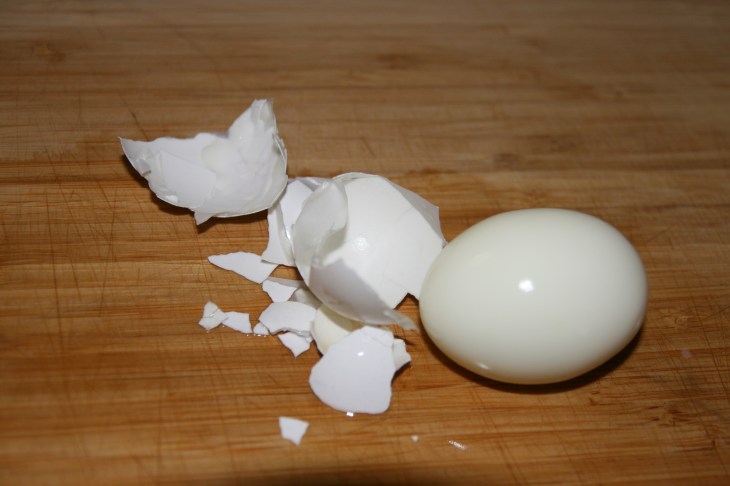 Au bout de 10 min, sortir l’œuf de la casserole d’eau bouillante et le passer rapidement sous l’eau froide. Cette dernière opération facilitera le retrait de la coquille. Fendre légèrement la coquille en tapant l’œuf sur une surface dure, puis écaler l’œuf. Réserver au frais.