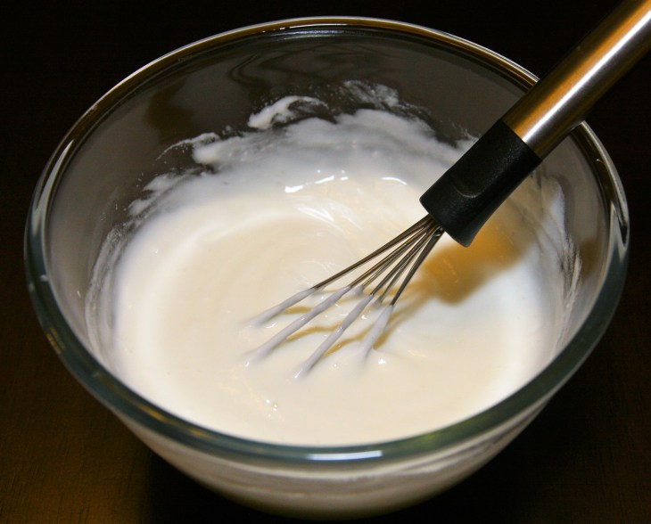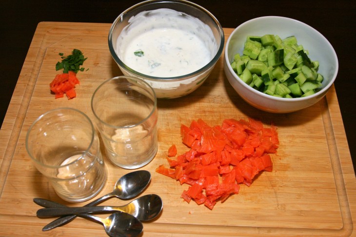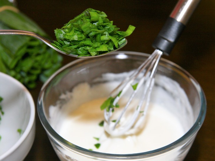 Take the equivalent of a big tablespoon of spring onion and mix with the yoghurt. Season with salt and pepper.