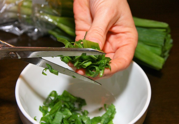 Wash the spring onions in water. With a knife or scissors, finely slice the green part of the spring onion.