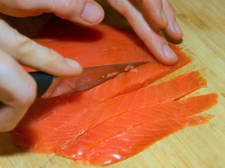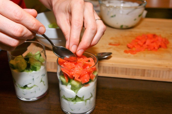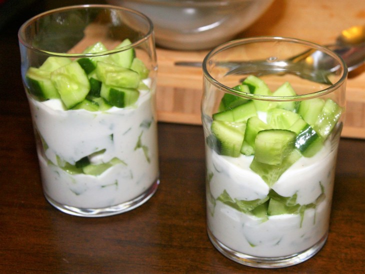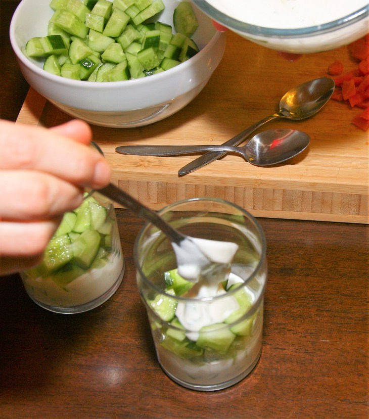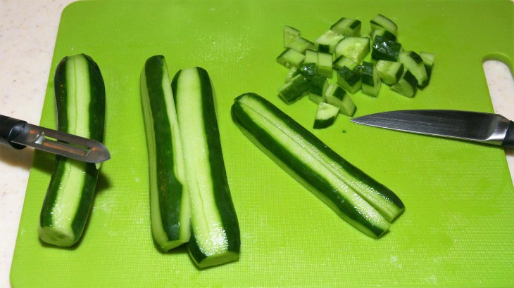 Cut the cucumber lengthwise, then remove the seeds in the centre of the vegetable by scraping with a small spoon.