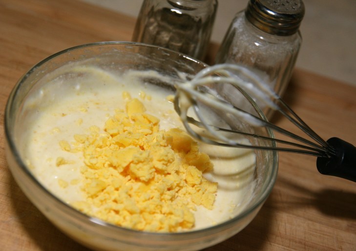 A l’aide d’une fourchette écraser le jaune de l’œuf.