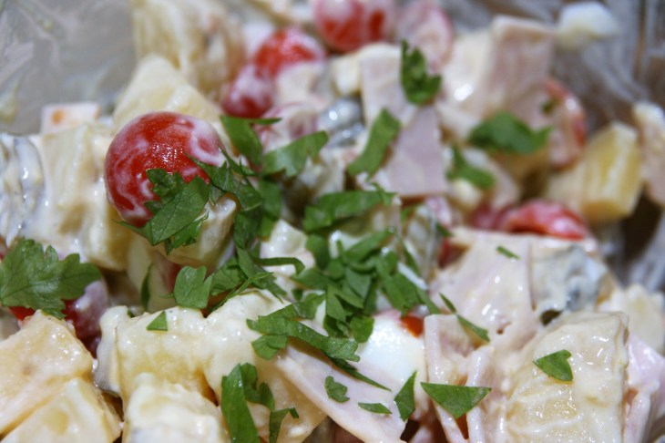 Dans un saladier, mélanger tous les ingrédients en morceaux : pommes de terre, tomates, dinde, cornichons, blanc d’œuf. Ajouter la mayonnaise allégée réalisée à l’étape 2. Mélanger.