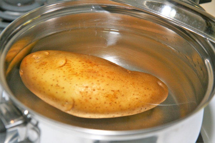 Cuisson des pommes de terre : mettre les pommes de terre dans l’eau bouillante, puis mettre un couvercle sur la casserole. Cuire 25-30 minutes à partir de la reprise de l’ébullition. Le temps de cuisson dépendra de la taille de vos pommes de terre. Pour vérifier la cuisson : planter la pointe d’un couteau dans la pomme de terre, cela se fait sans résistance si la pomme de terre est assez cuite.
