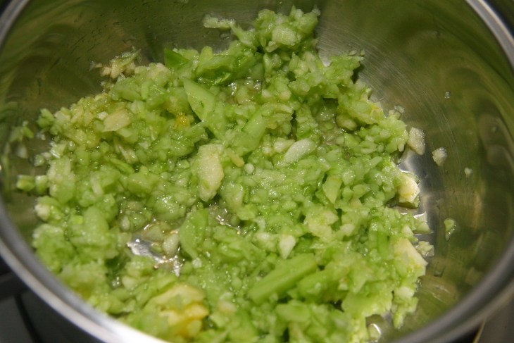 Mixer grossièrement les morceaux de concombre et pommes au robot.