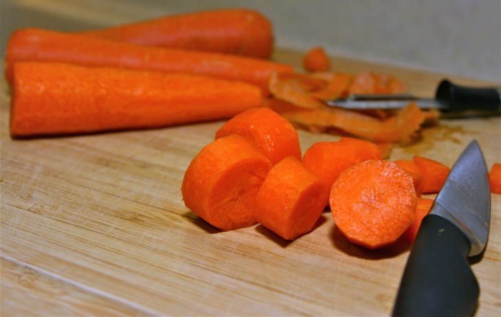 Préparer les carottes : couper les extrémités, éplucher et rincer à l’eau.
