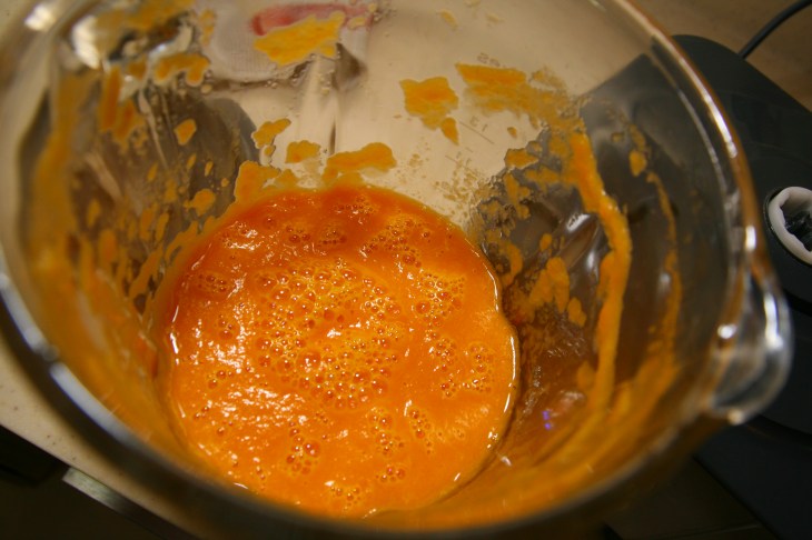 Mixer le contenu de la casserole (carottes + jus) jusqu’à obtenir une soupe lisse sans morceaux.