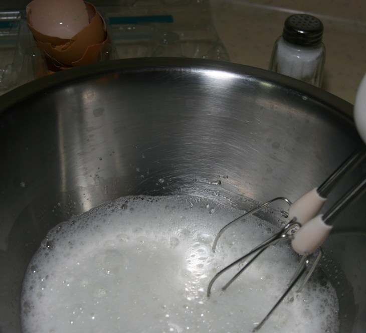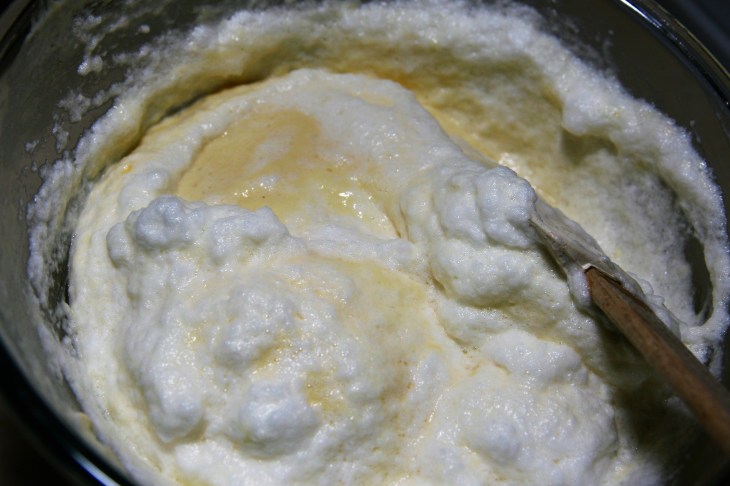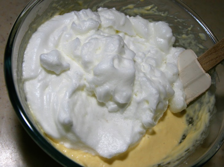 Then add gradually the flour and baking powder while whipping the preparation to avoid lumps.