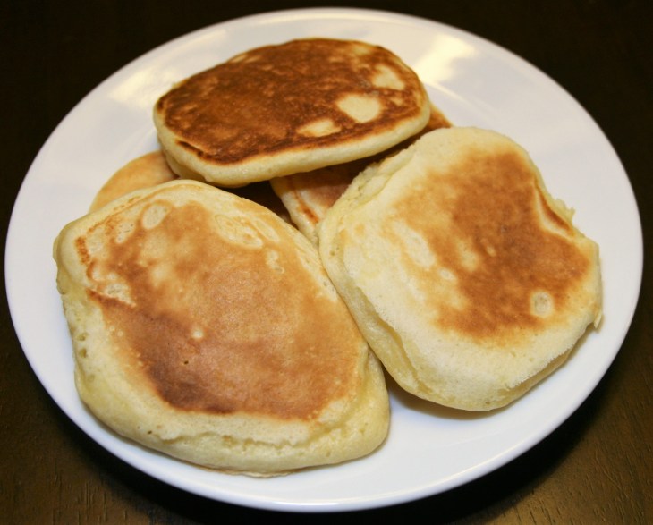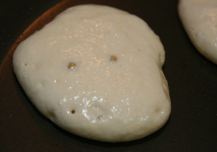 Pour pancake batter (½ ladle) in pile into the hot pan: as soon as bubbles are formed, flip the pancakes and cook the other side.