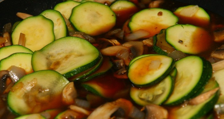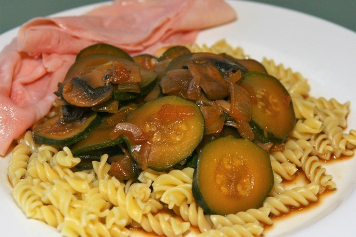Pan-fried zucchini and mushrooms with pasta and ham: