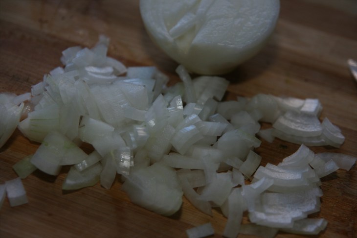 Onion: Peel the onion and cut the ends. Cut in half, remove the sprout, then wash with water. Slice the onion.