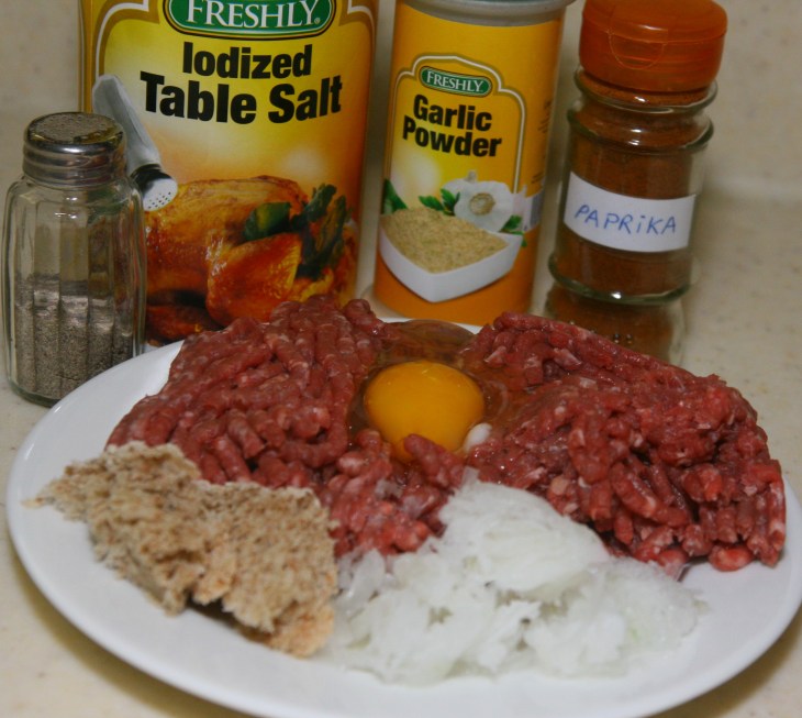 Put in a mixer all the ingredients for the meatballs: beef, egg, bread, onion, garlic, paprika, salt and pepper.