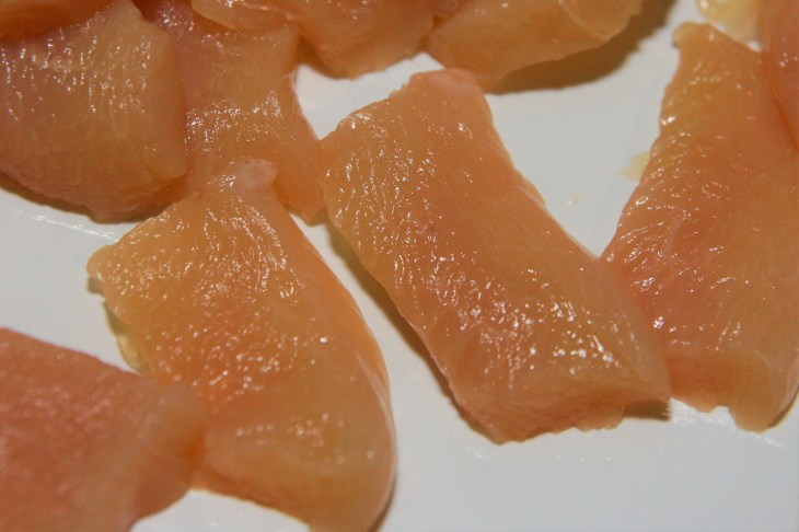 In a frying pan, heat a tablespoon of oil and brown the chicken over high heat. Stop cooking when the chicken is cooked and lightly browned. Set aside the chicken on a plate.