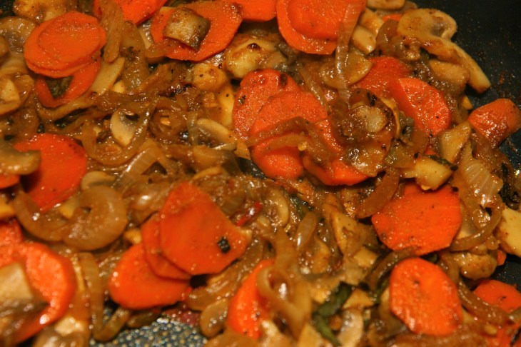 Then add the carrots, mushrooms and a few spoons of broth (made in step 3): the broth prevents the vegetables from sticking to the pan. Mix.