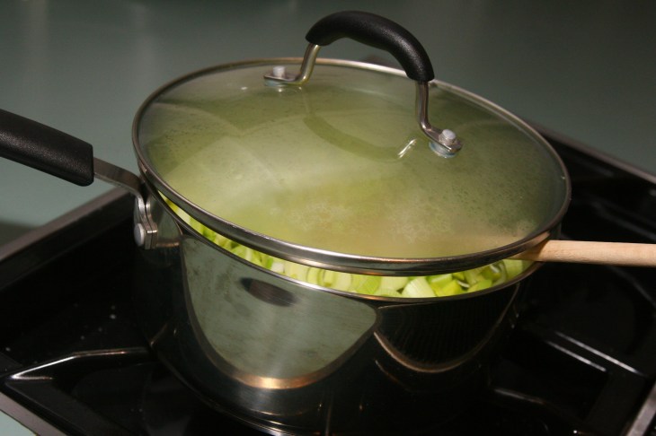 Dans une casserole, mettre les morceaux de poireau et l’eau. Poser un couvercle sur la casserole.