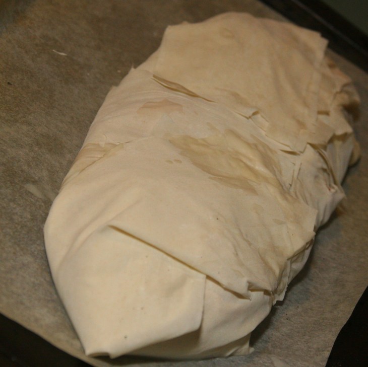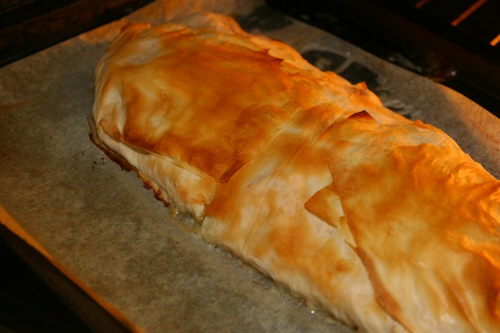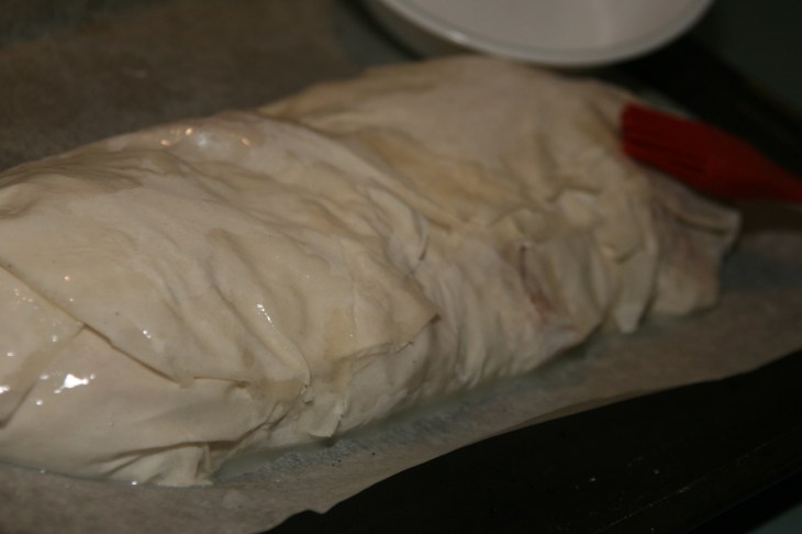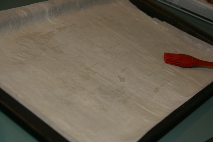 Si vous utilisez de la pâte phyllo : déposer une feuille de pâte phyllo sur plaque de cuisson recouverte d’un papier sulfurisé. Badigeonner la feuille de pâte phyllo d’eau avec un pinceau, puis poser une seconde feuille de pâte phyllo. Continuer ainsi jusqu’à superposer 4 feuilles de pâte phyllo.