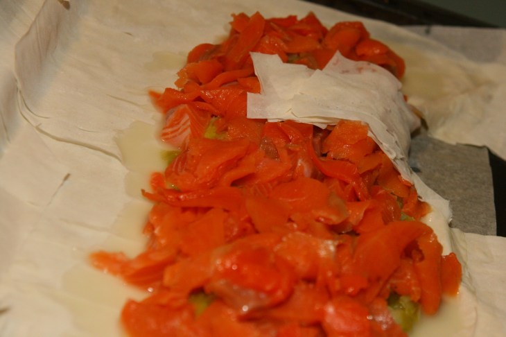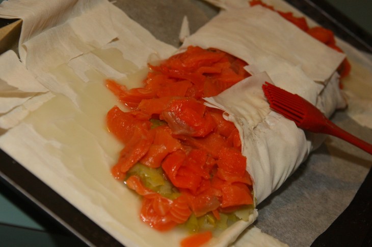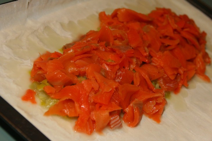 Répartir les morceaux de saumon frais sur le poireau, puis le saumon fumé.