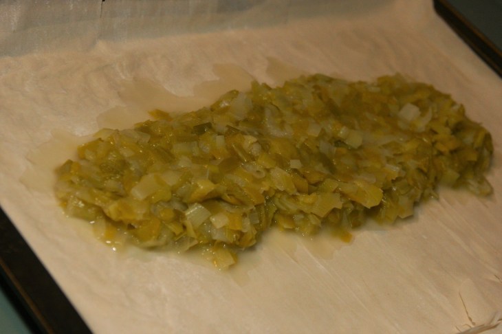 Au centre de la pâte feuilletée, déposer le poireau cuit.