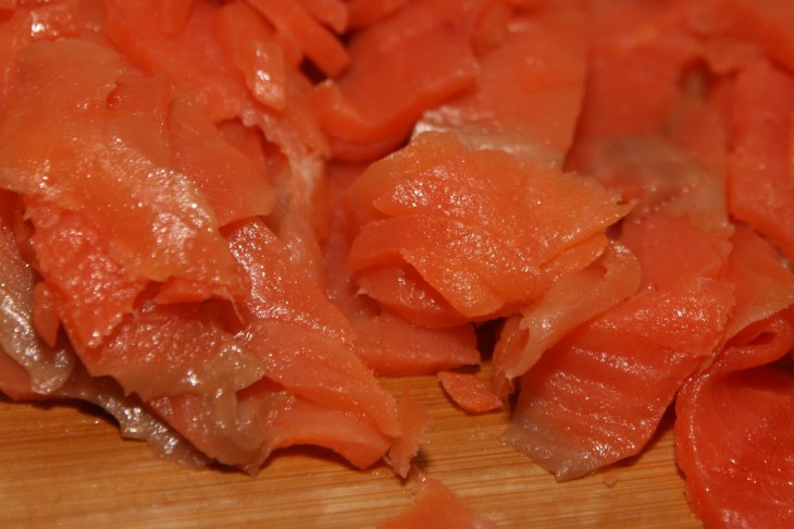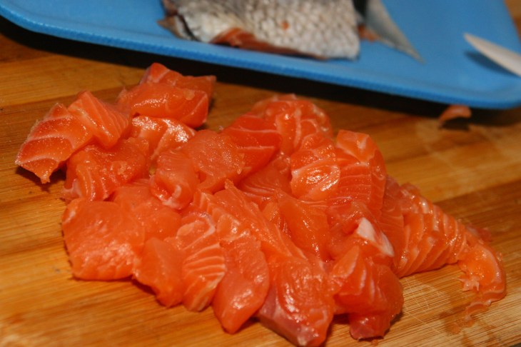 • Couper le saumon frais et le saumon fumé en morceaux de taille uniforme. Réserver.