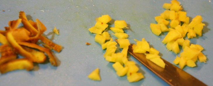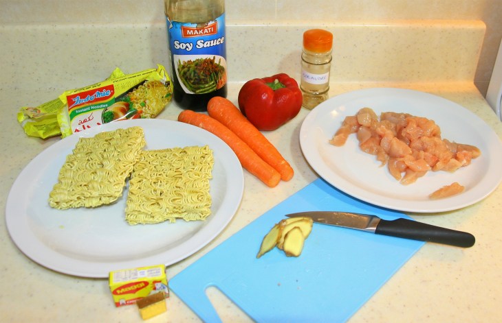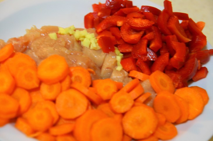 Dans une casserole, faire chauffer l’huile et y faire revenir le poulet, les légumes et le gingembre. Mélanger.