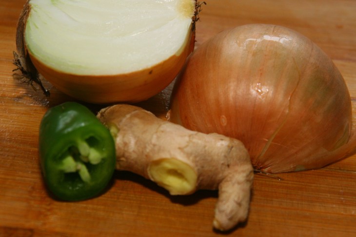 Chop the onion, ginger and chili together until you get a paste. Try the spiciness of the mixture to measure the chili to your taste!