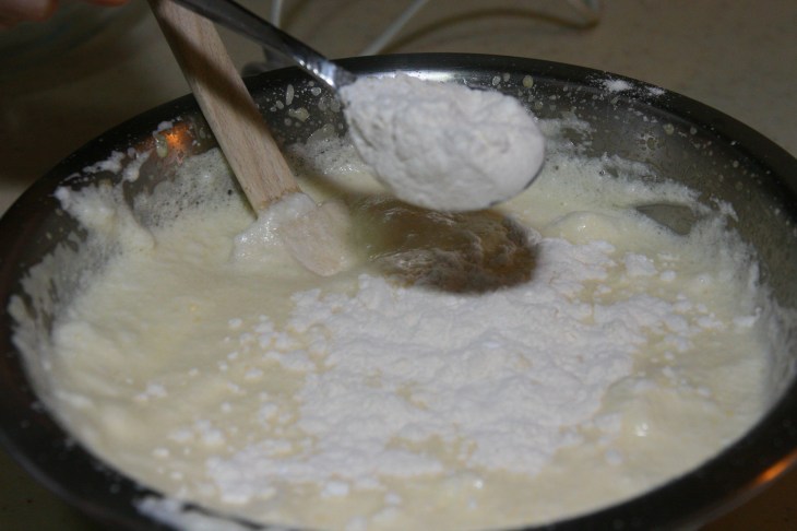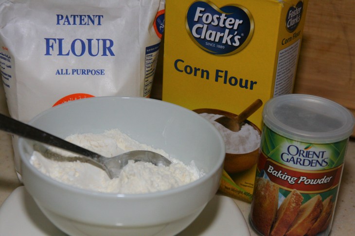 Mélanger la farine, la fécule de maïs et la levure chimique ensemble.