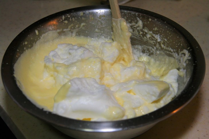 Verser ce mélange sur les blancs d’œuf en neige. Mélanger en brassant tous les ingrédients délicatement à l’aide d’une spatule ; il est important de ne pas fouetter le mélange pour éviter de « casser » les blancs en neige. Continuer ainsi jusqu’à obtenir une mousse homogène ; il ne doit rester aucune trace de blancs en neige. Réserver.