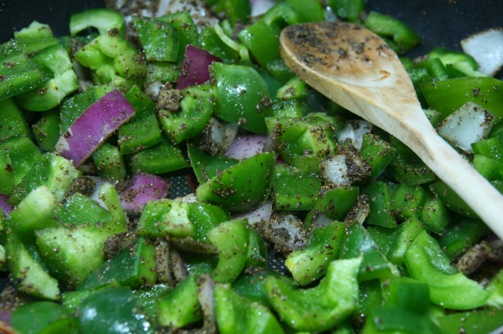 Verser cette mixture dans la poêle avec les poivrons. Mélanger.