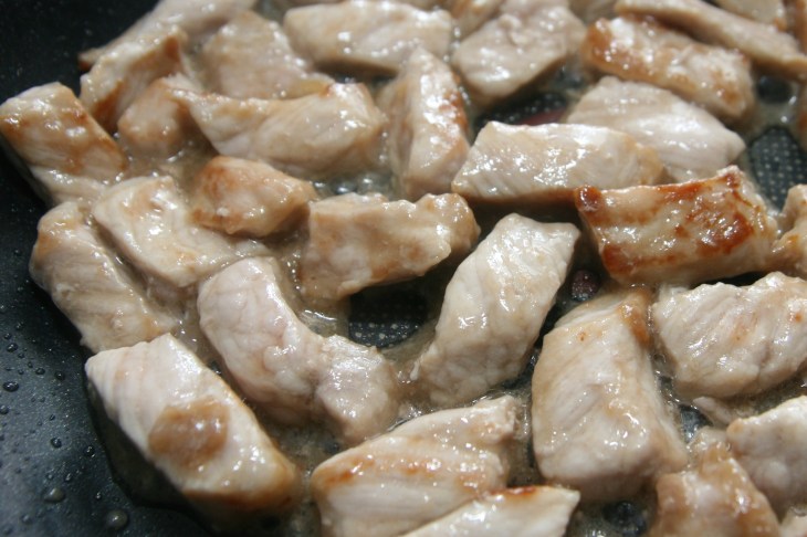 Dans une poêle, faire chauffer 1 cuillère à soupe d’huile et y faire revenir les morceaux de porc. Poursuivre la cuisson jusqu’à ce que tous les morceaux de porc soient bien dorés.