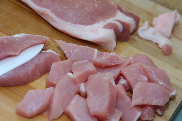 Après avoir retirer l’excès de gras, couper le porc en morceaux réguliers.