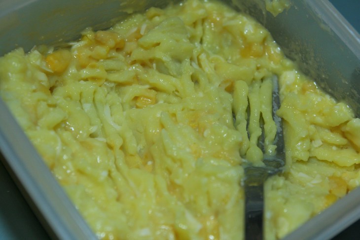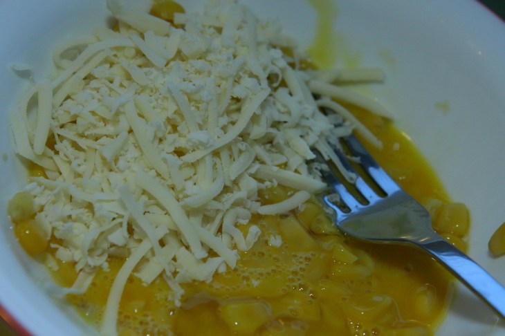 Ajouter le maïs et le fromage râpé. Mélanger jusqu’à obtenir un mélange homogène des ingrédients.