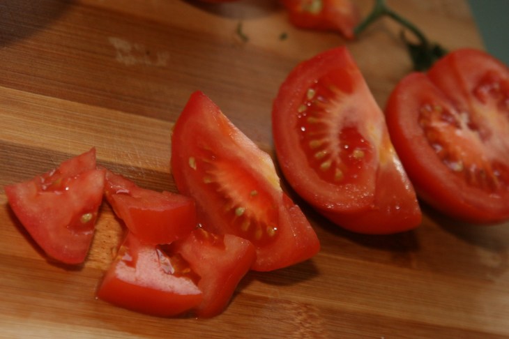 Tomates : Rincer à l’eau. Retirer la partie dure au niveau du pédoncule, puis couper en dés.