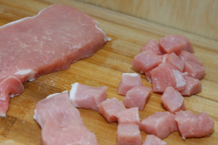 Retirer l’excès de gras, puis couper le porc en petits cubes.