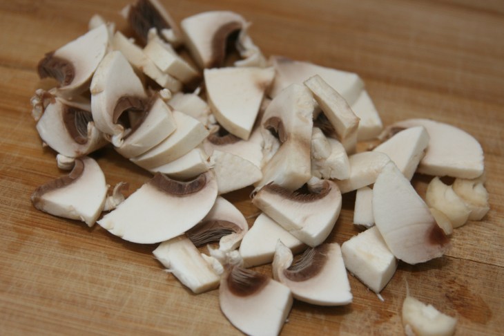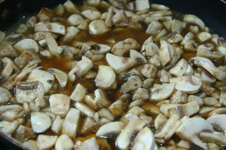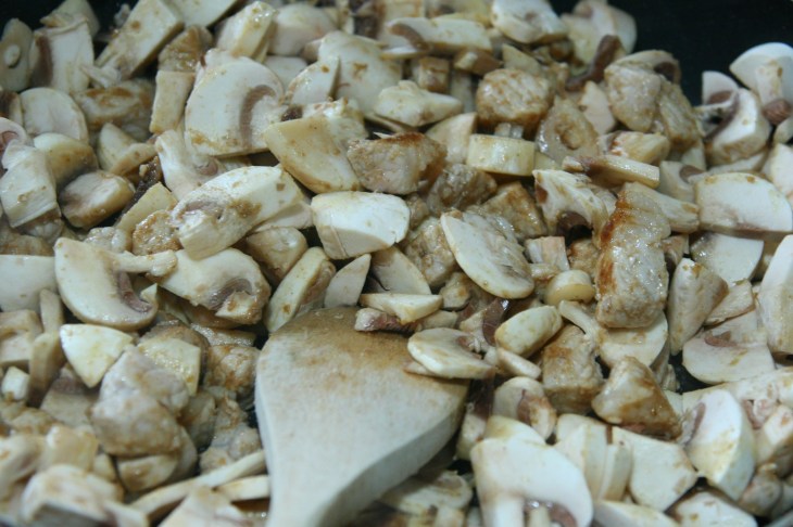 Lorsque les morceaux de porc sont légèrement dorés, ajouter les champignons. Mélanger.