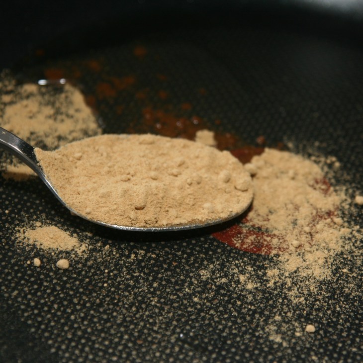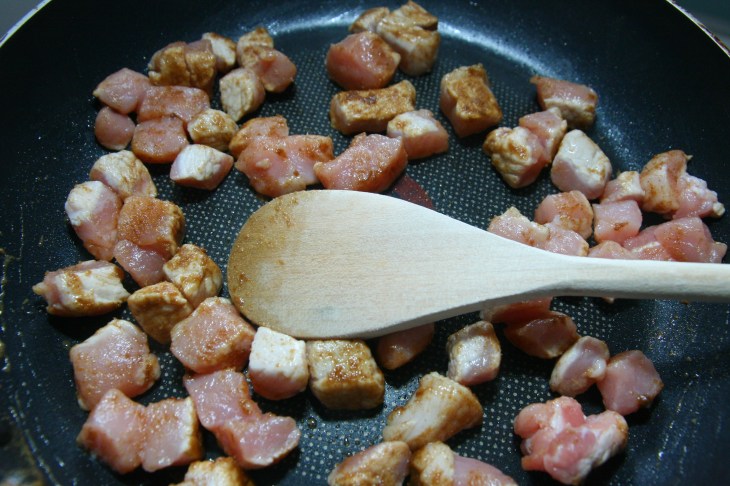 Dans une poêle ou un wok, chauffer l’huile avec le gingembre moulu sur feu doux (3/10). Lorsque le gingembre commence à dorer, ajouter les cubes de porc. Mélanger.