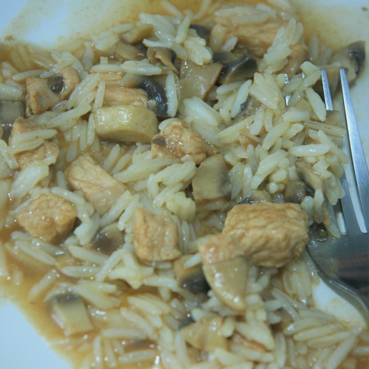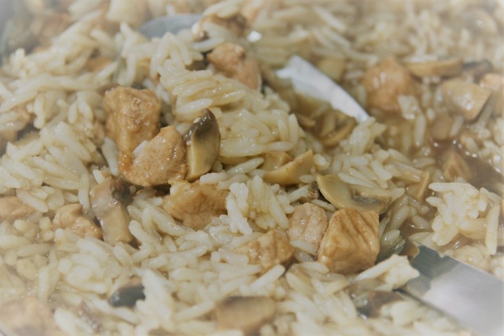Après 10 minutes de cuisson, ajouter le riz cuit. Mélanger et poursuivre la cuisson quelques minutes… Lorsque tous les grains de riz sont enrobés de sauce et assez réchauffés, votre plat est prêt à être servi.