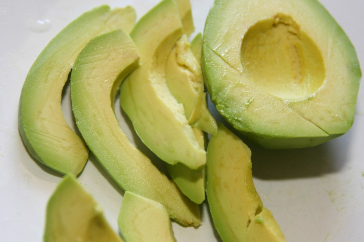 Peler l’avocat et retirer le noyau. Couper la chair en lamelles.