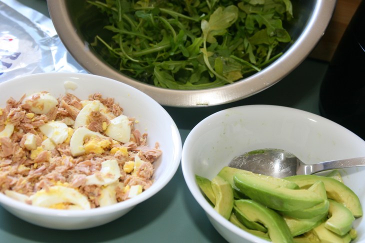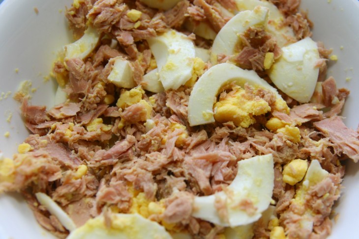 Dans un saladier, mélanger ensemble le thon émietté et les œufs durs refroidis.