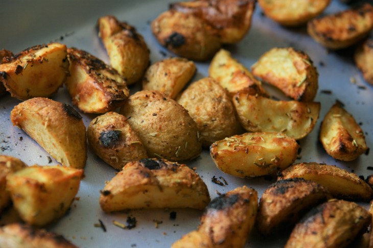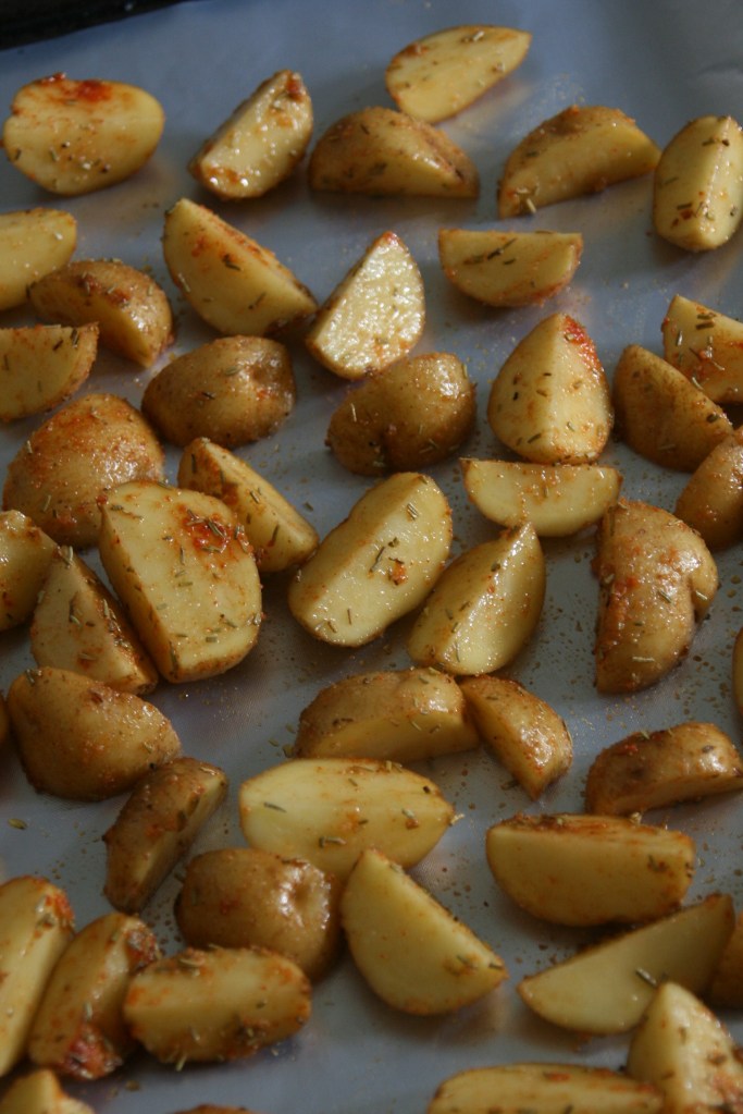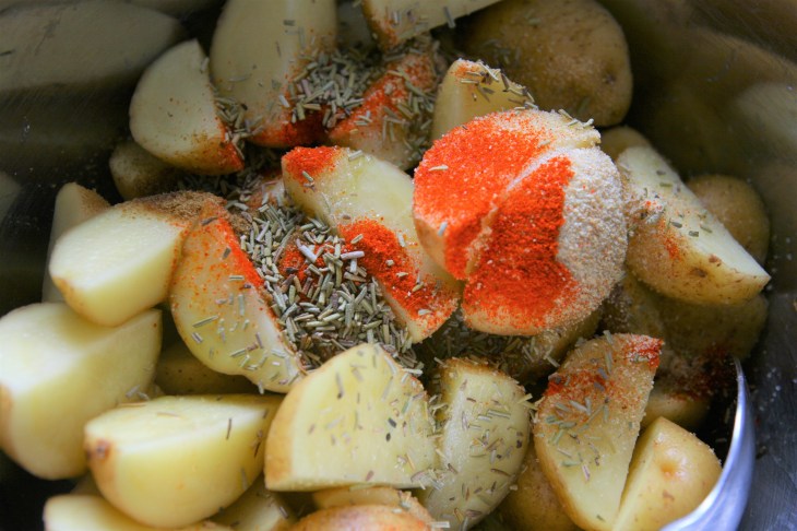 In a bowl, put the potatoes, oil, garlic, rosemary, paprika, cumin and salt. Mix until the potatoes are well coated.