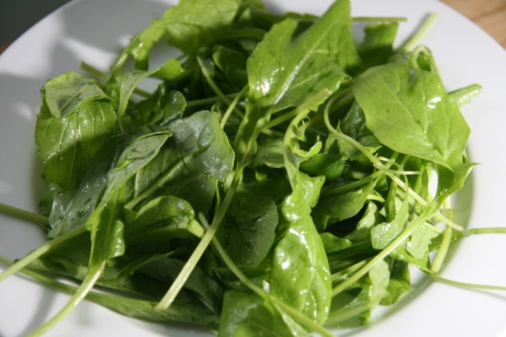 During the potatoes cooking, mix all the salad ingredients: arugula, lemon juice, olive oil, water, salt and pepper.