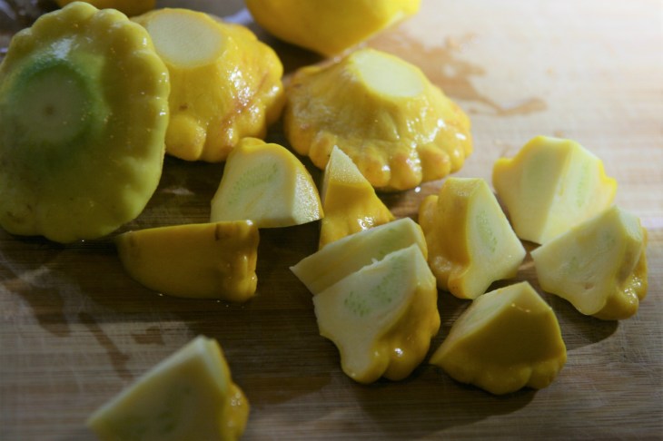 Couper en deux; si il y a beaucoup de graines à l’intérieur , ce qui est le cas des pâtissons de grandes tailles, retirer les graines.