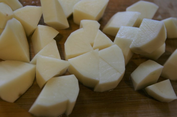 Découper en morceaux de taille uniforme, légèrement plus grands que les dés de pommes de terre.