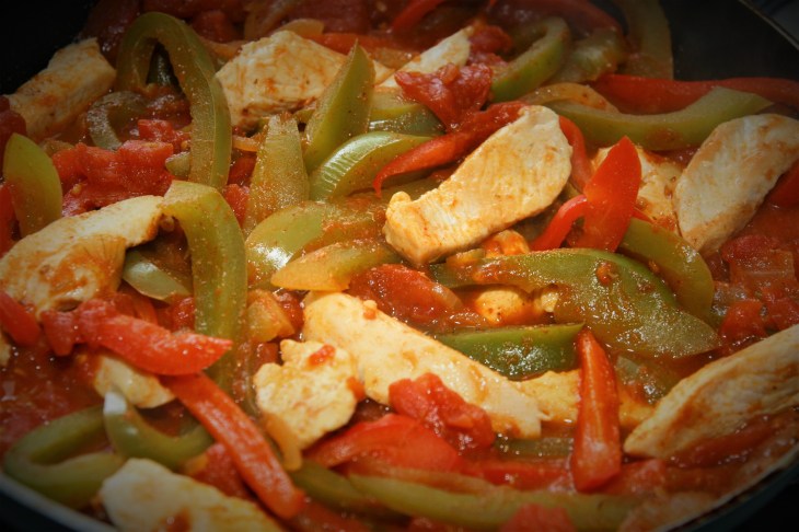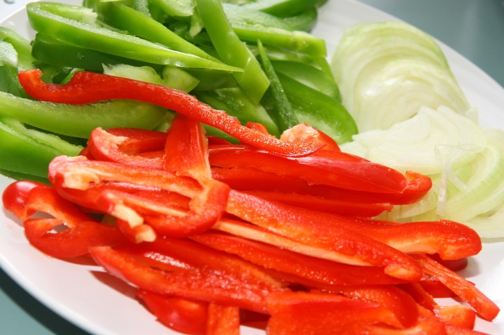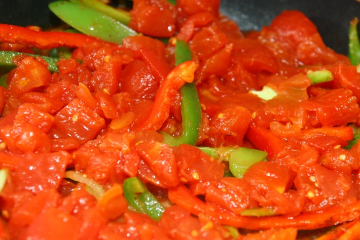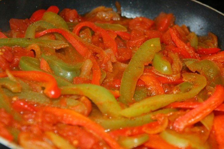 Add the strips of bell peppers. Mix and cook for 3 minutes, stirring constantly.