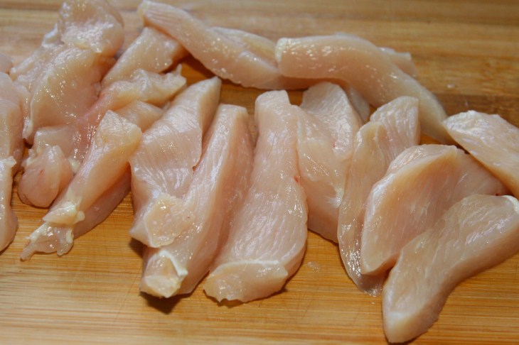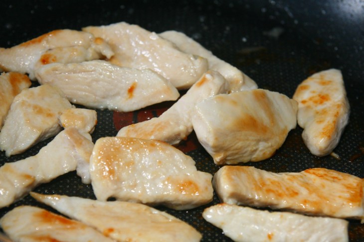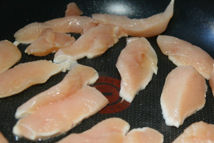 Heat 1 teaspoon of oil in a pan and fry the chicken strips for a few moments.