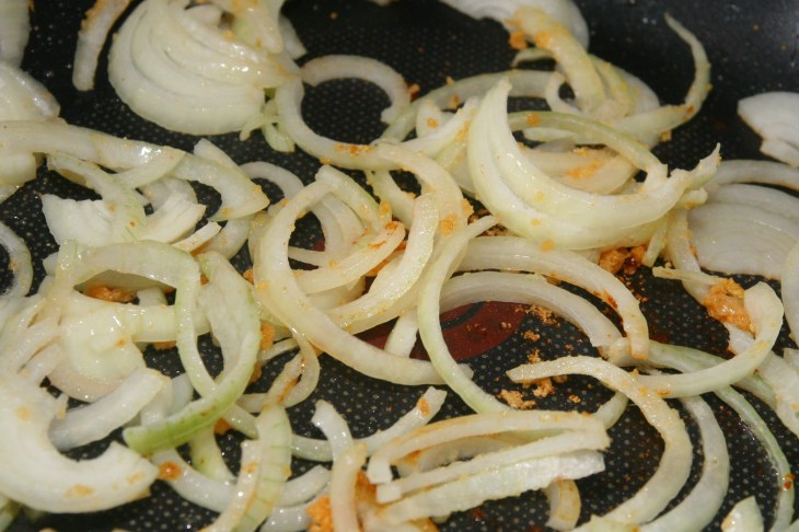 In the same pan you used to cook the chicken, heat another teaspoon of oil and fry onion and garlic powder for 2 minutes.