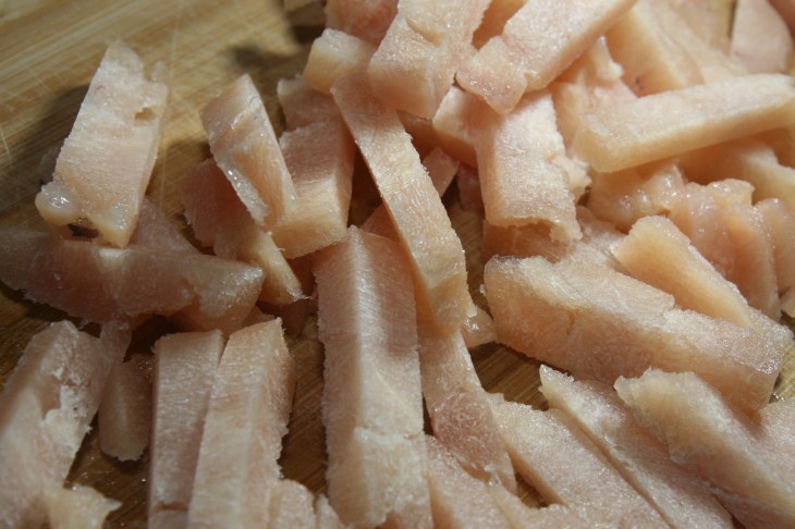 Dans un bol, mélanger les lanières de poulet avec les ingrédients de la marinade (sauce soja et farine de maïs). Couvrir d’un film plastique et mettre au réfrigérateur pendant 24h.