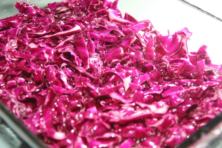 Dans un plat, mélanger tous les ingrédients pour l’assaisonnement du chou-rouge (jus de pomme, miel et vinaigre de riz), puis ajouter les lanières de chou.
